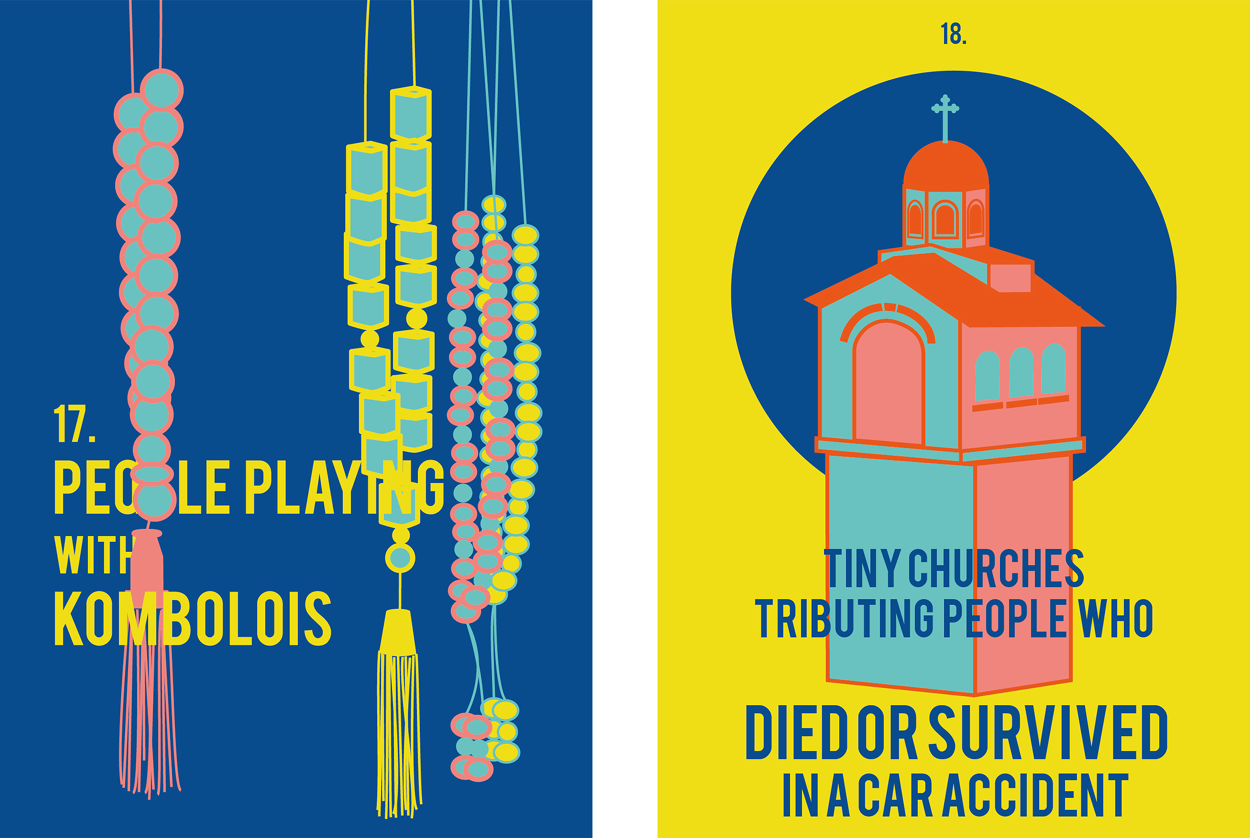 Réalisé pendant un stage sur place pendant 3 mois. Détails de la vie athénienne (principalement). Des cartes postales qui trahissent leur forme habituelle pour changer des images médiatiques de l’île paradisiaque ou du pays endetté.