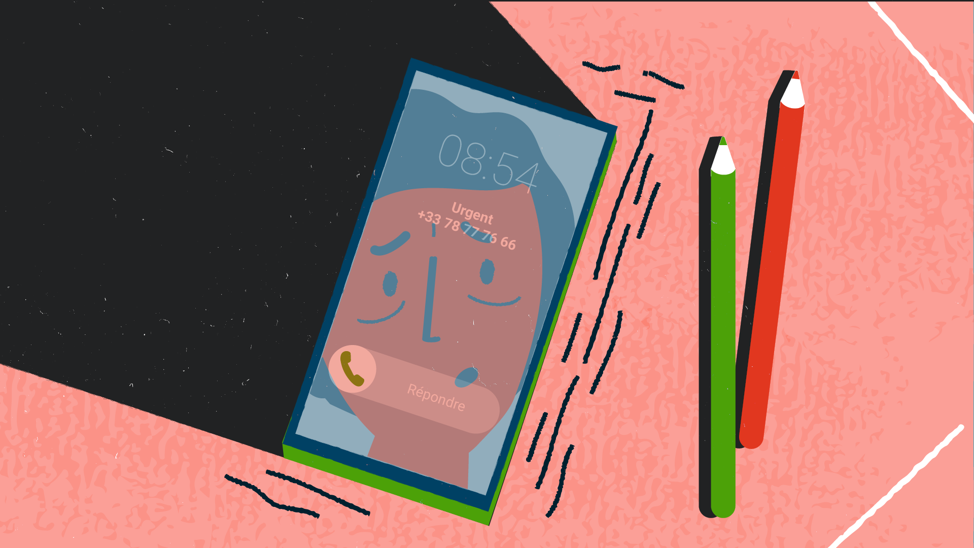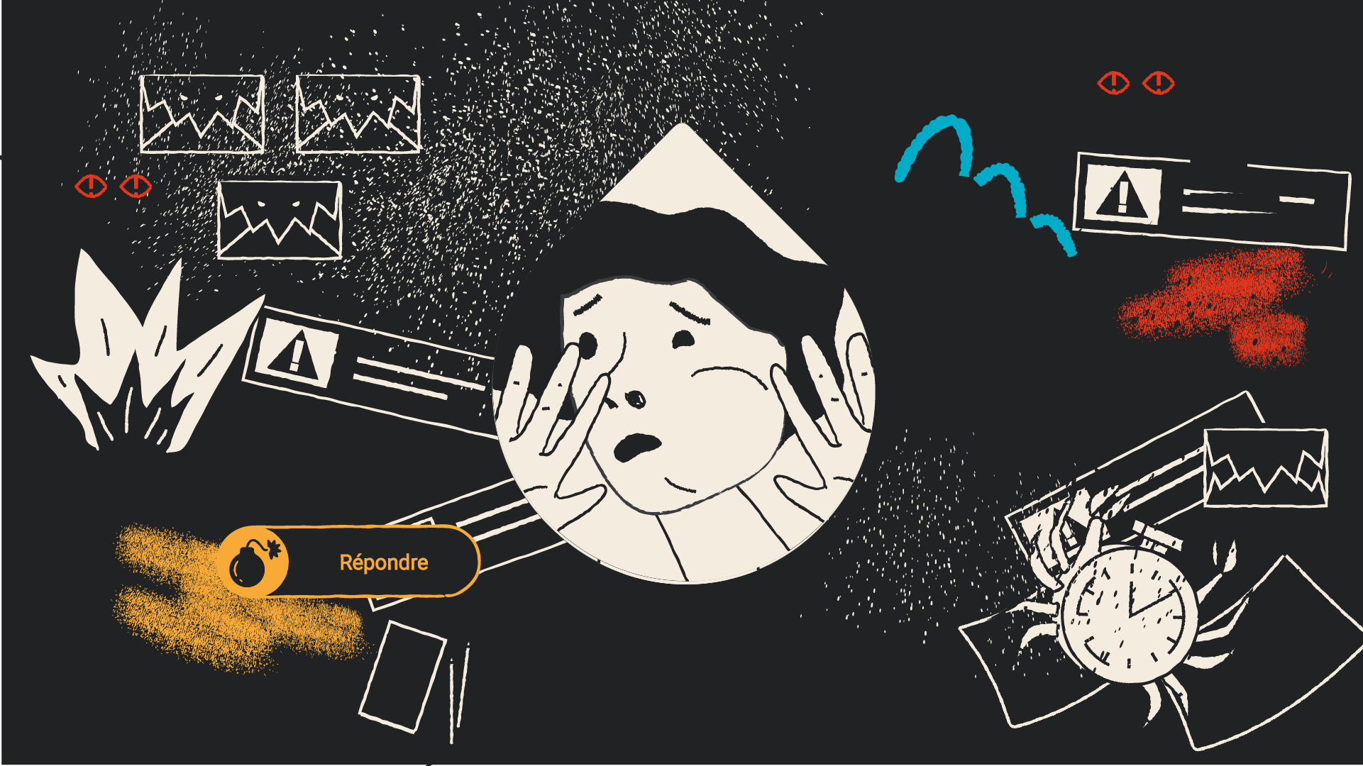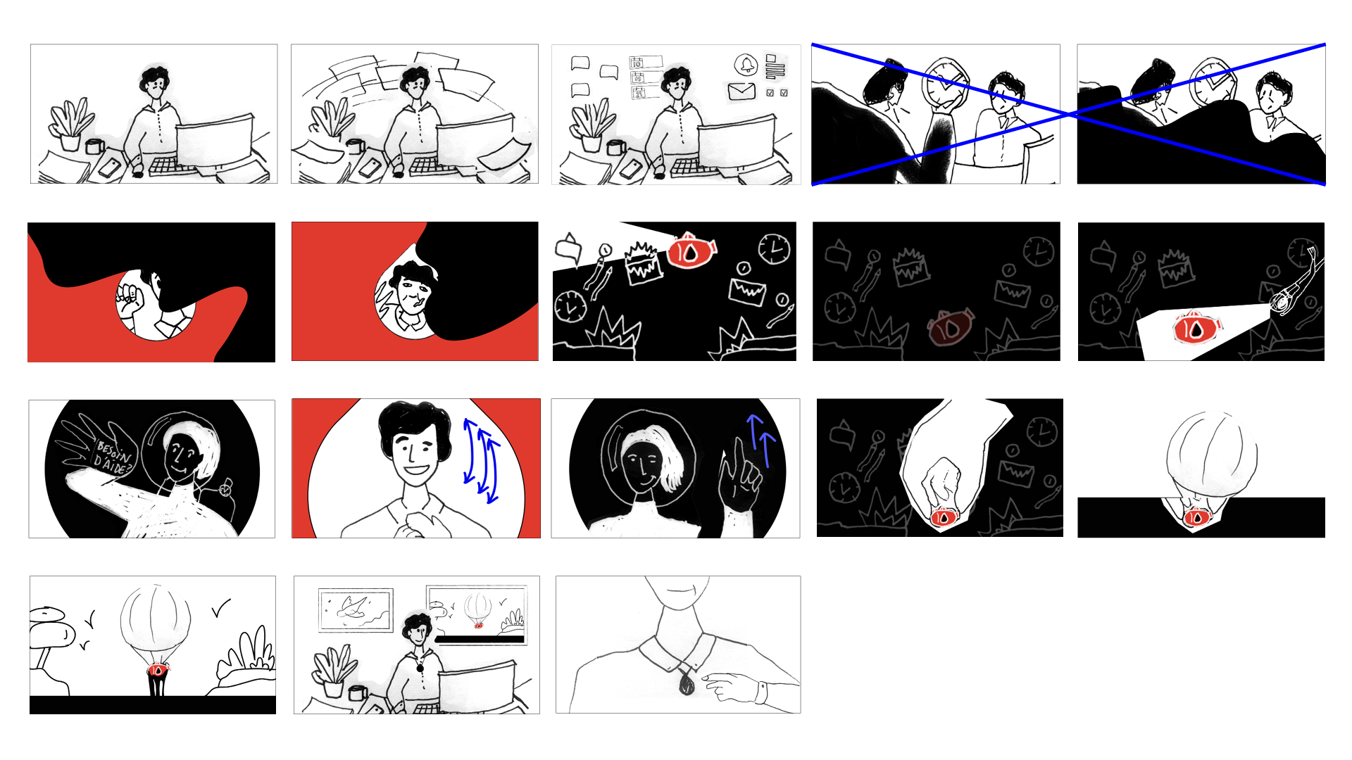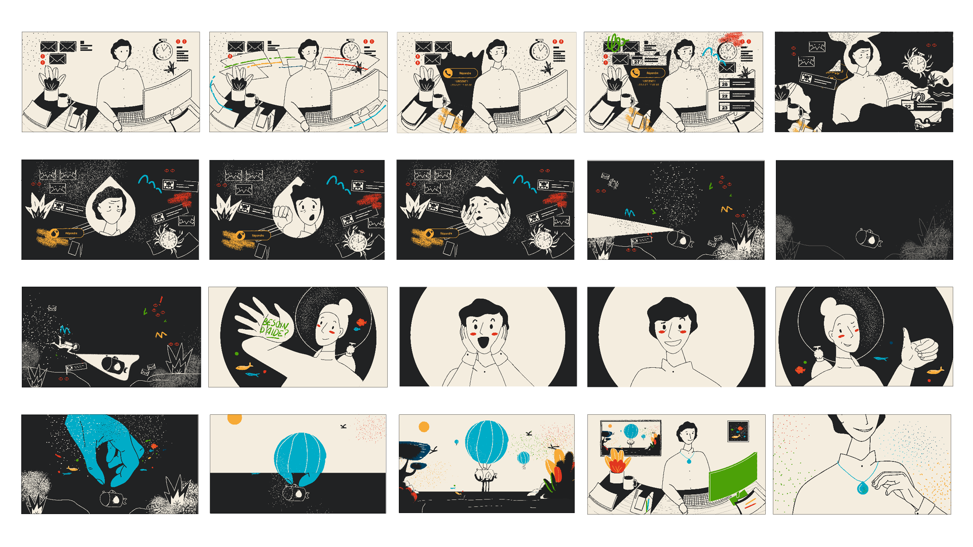 Je participe à la métaphore en formalisant le storyboard, les rythmes et cadrages, et en proposant deux styles graphiques avant de les décliner en illustrations décomposées et accompagnées d’intentions d’animation. L’un de ces styles, qui sera retenu, joue sur la dualité ombre et lumière et met en exergue les émotions du travailleur, avant, pendant et après. L’autre, coloré et inspiré du collage, rappelle l’imaginaire où tout se joue, avec des formes et motifs qui seraient animés de façon à être tantôt paisibles et rassurants, tantôt angoissants et oppressants.