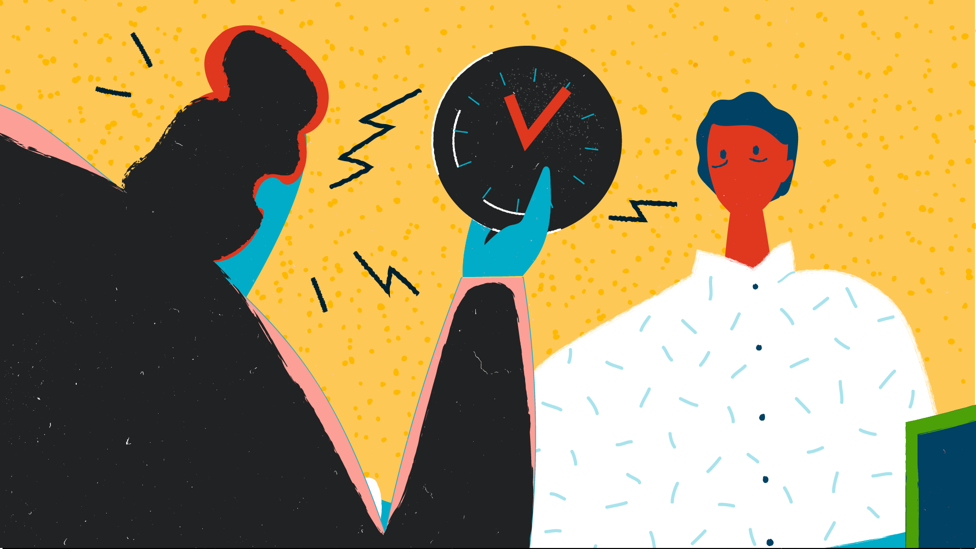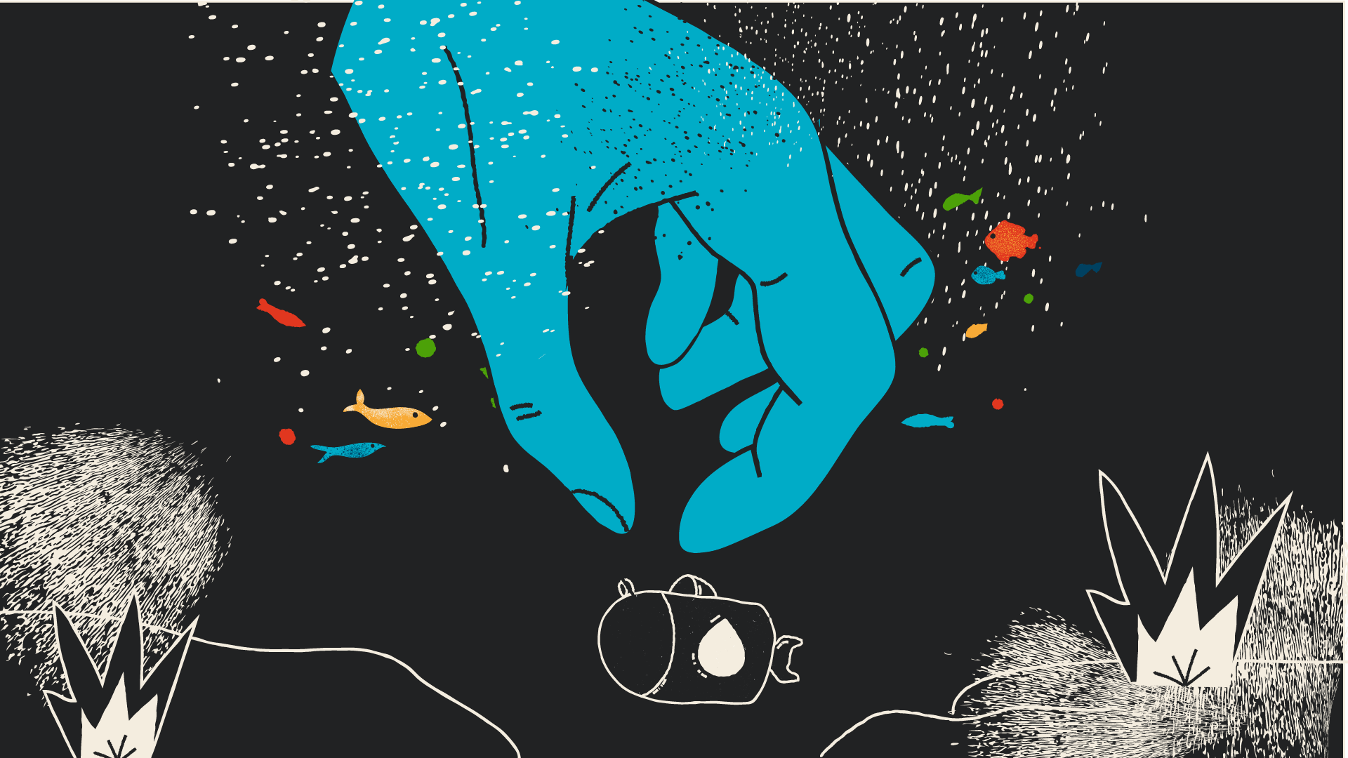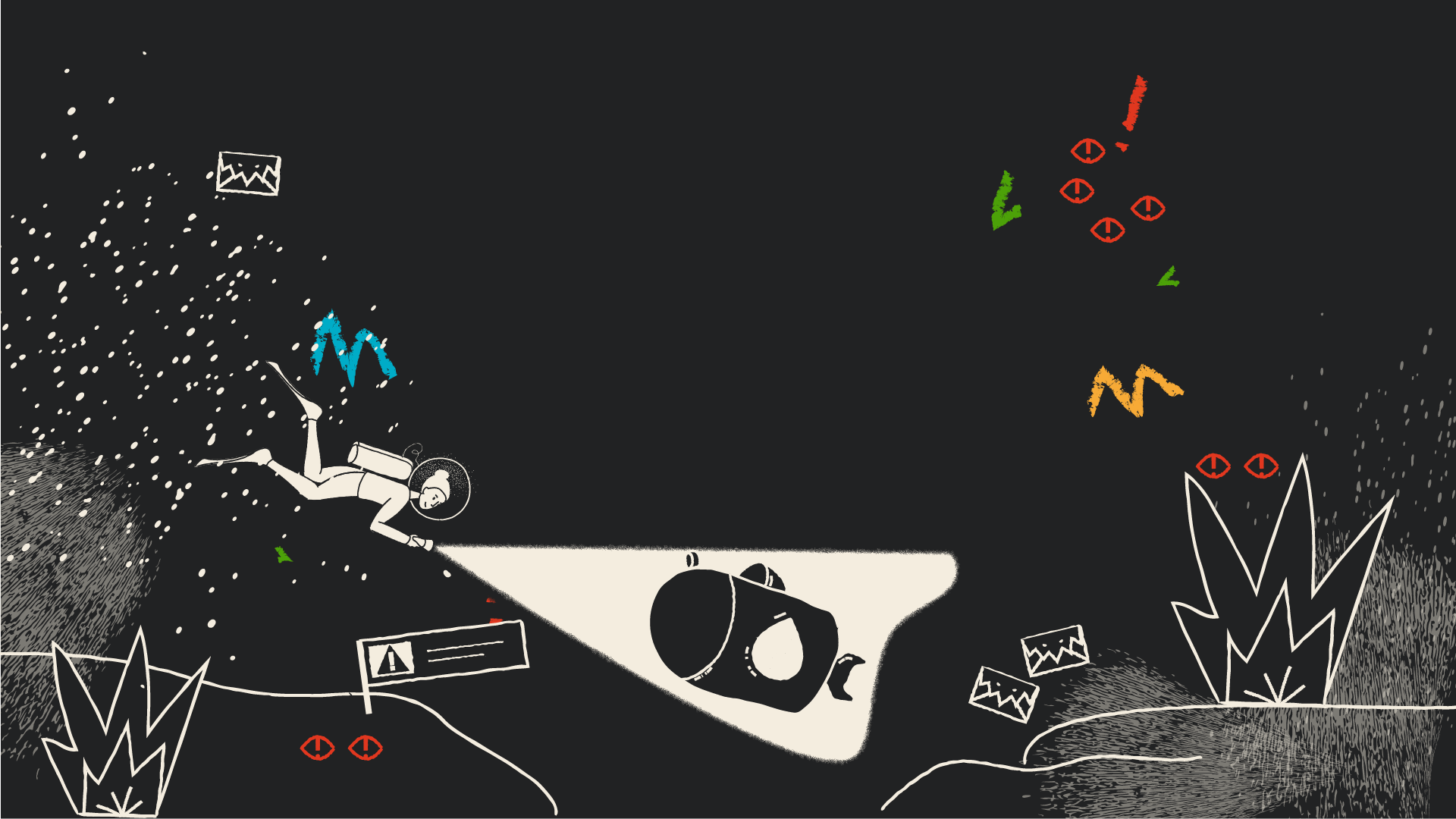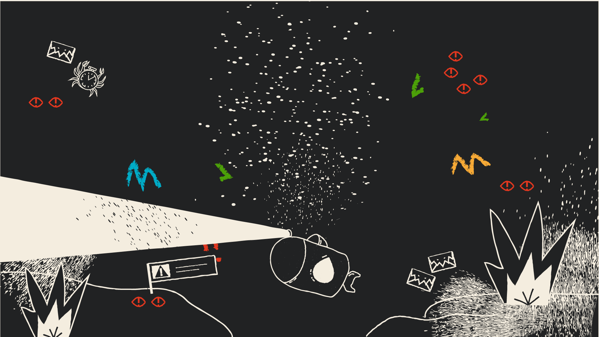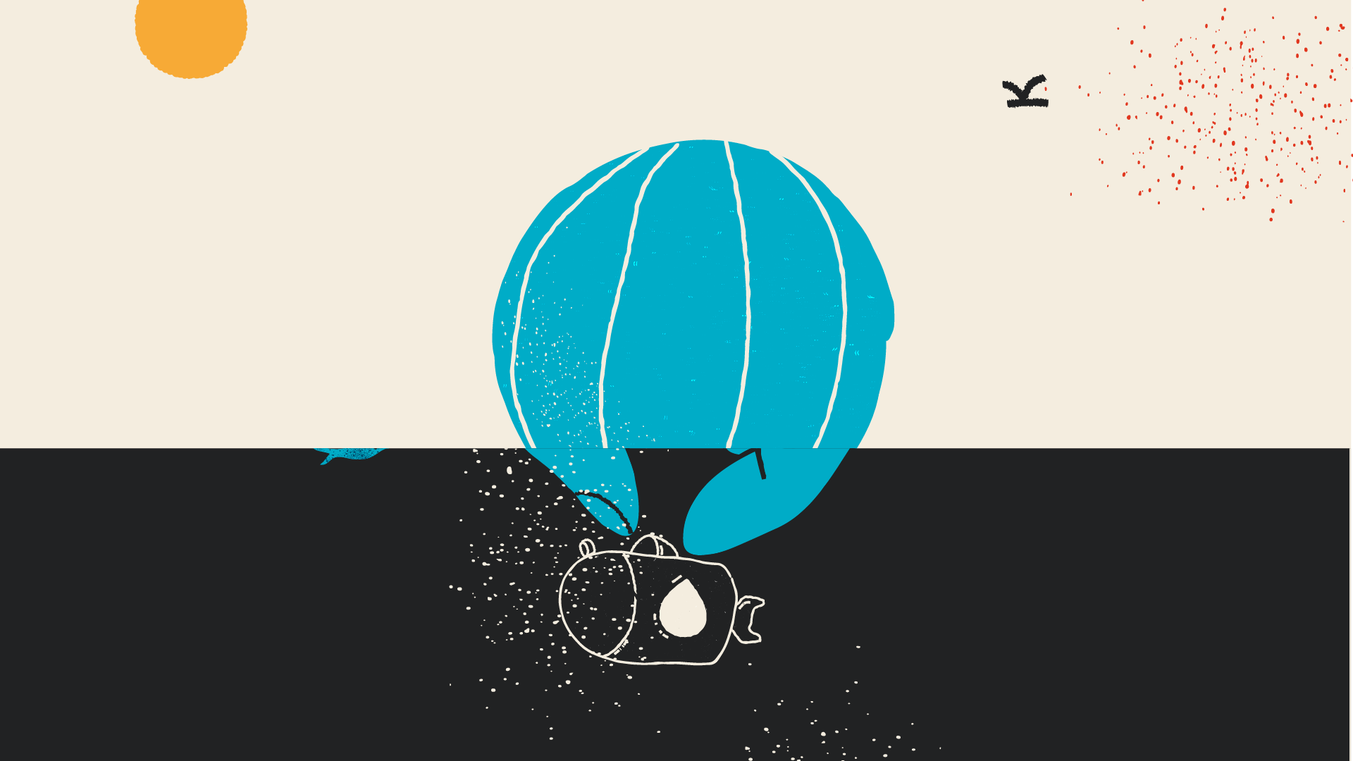 Je participe à la métaphore en formalisant le storyboard, les rythmes et cadrages, et en proposant deux styles graphiques avant de les décliner en illustrations décomposées et accompagnées d’intentions d’animation. L’un de ces styles, qui sera retenu, joue sur la dualité ombre et lumière et met en exergue les émotions du travailleur, avant, pendant et après. L’autre, coloré et inspiré du collage, rappelle l’imaginaire où tout se joue, avec des formes et motifs qui seraient animés de façon à être tantôt paisibles et rassurants, tantôt angoissants et oppressants.