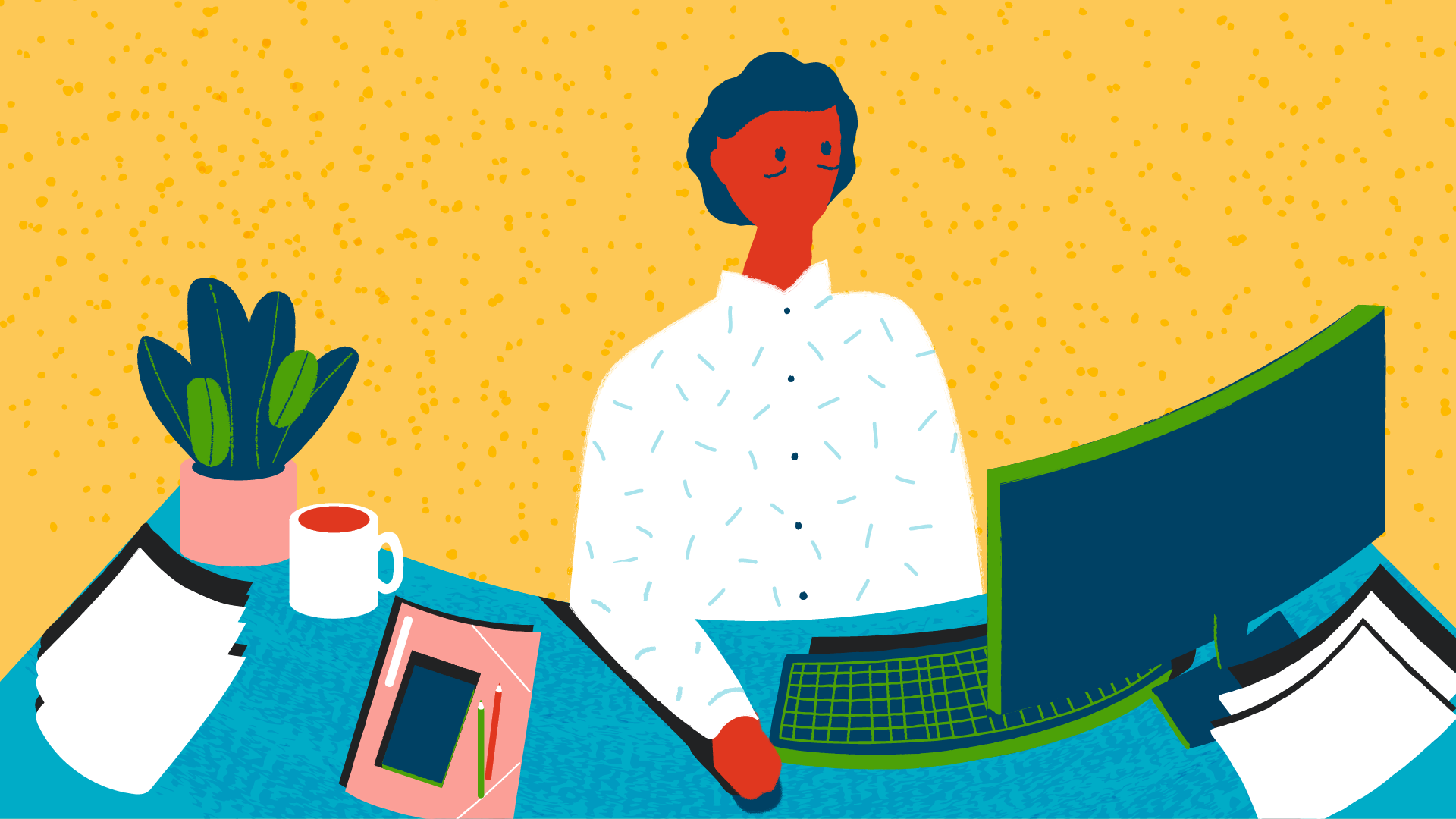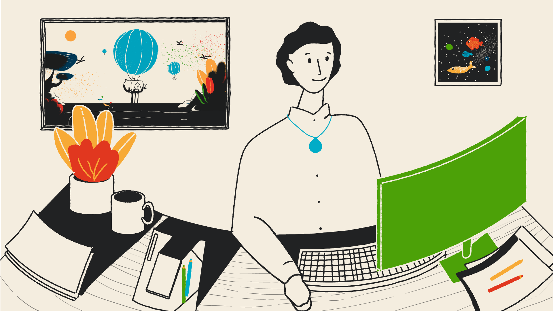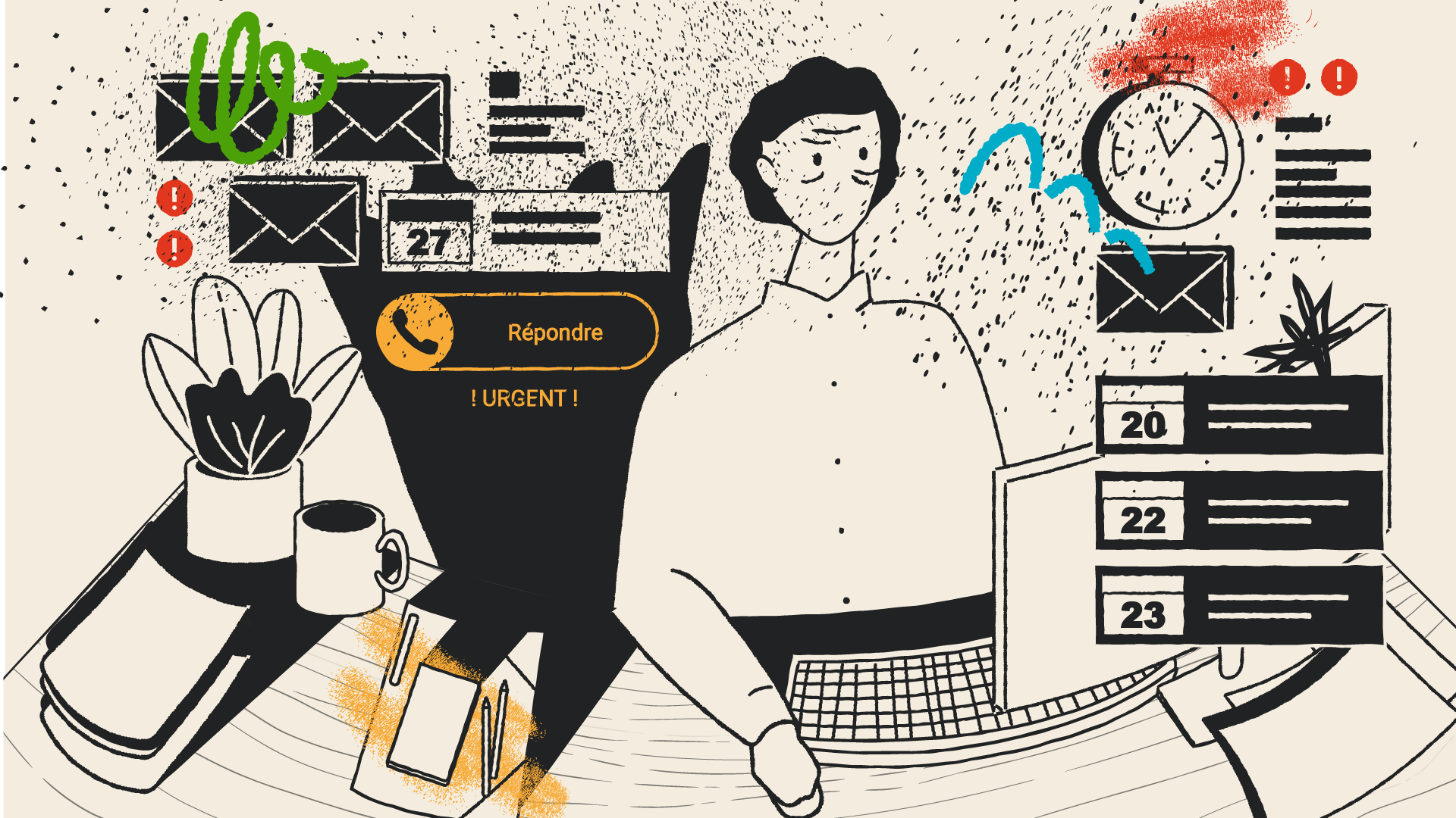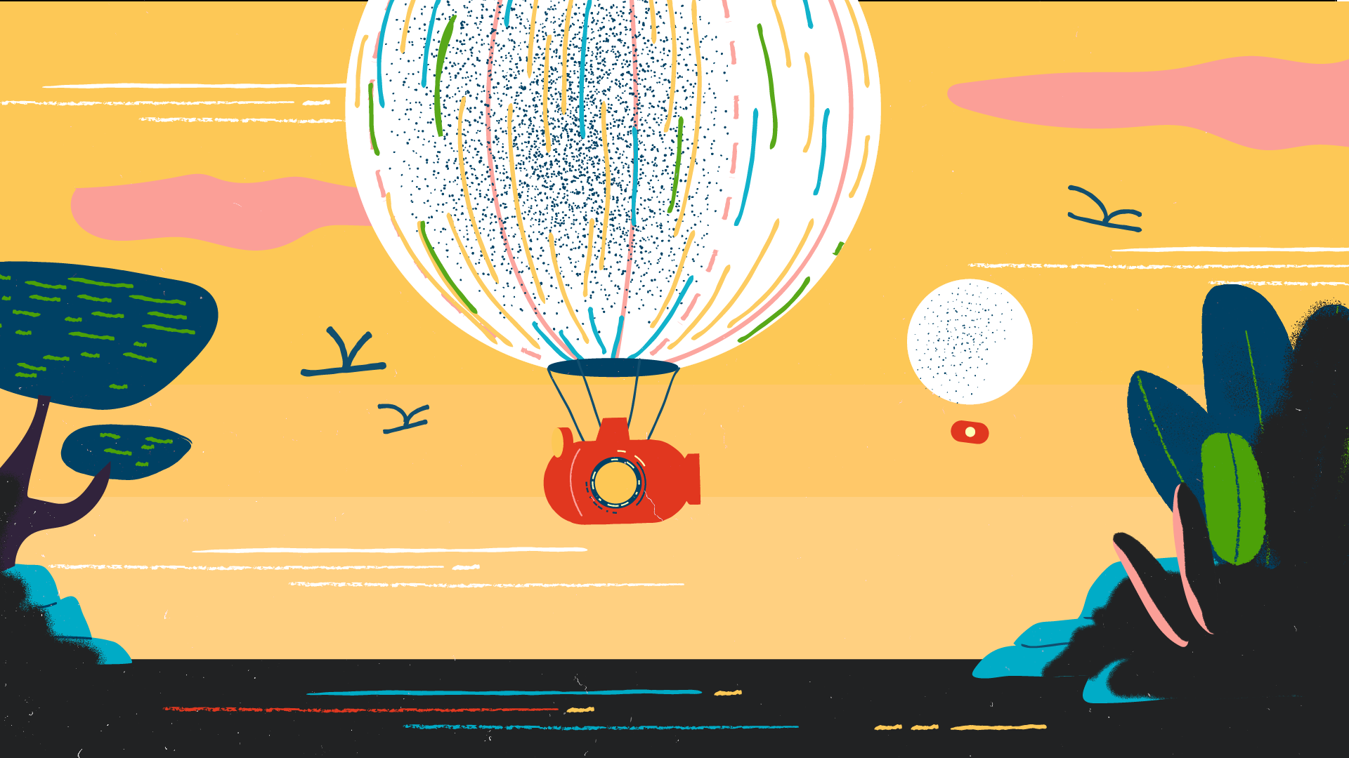 Je participe à la métaphore en formalisant le storyboard, les rythmes et cadrages, et en proposant deux styles graphiques avant de les décliner en illustrations décomposées et accompagnées d’intentions d’animation. L’un de ces styles, qui sera retenu, joue sur la dualité ombre et lumière et met en exergue les émotions du travailleur, avant, pendant et après. L’autre, coloré et inspiré du collage, rappelle l’imaginaire où tout se joue, avec des formes et motifs qui seraient animés de façon à être tantôt paisibles et rassurants, tantôt angoissants et oppressants.
