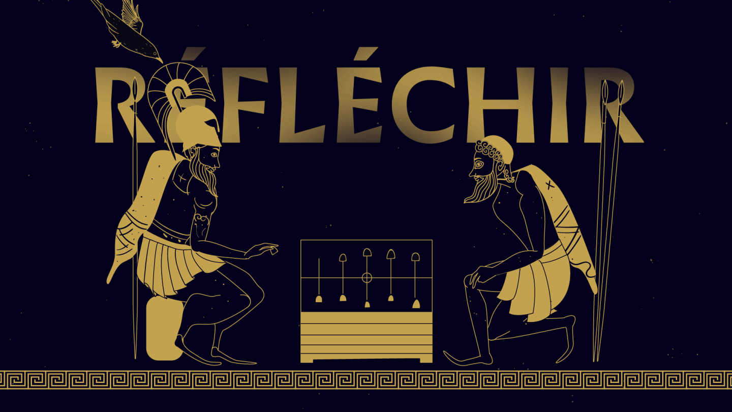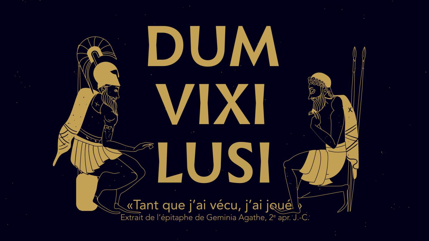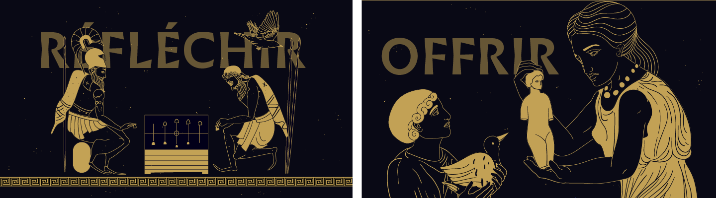 Les illustrations sont inspirées de vases et statues antiques, aspect renforcé en vidéo par des transitions horizontales et des plans séquences. Mixé avec des couleurs franches et un rythme soutenu, on sous-entend un regard contemporain sur la société antique, et des parallèles entre celle-ci et la nôtre. Le mouvement est également mis en valeur, indissociable du jeu, et le matériel lui-même, parfois étonnament similaire à celui d’aujourd’hui. L’objet ludique est toujours celui qui emmène les transitions d’un plan à l’autre. La typographie Infini de Sandrine Nugue, qui évoque à la fois le mélange des époques et le jeu, avec ses ligatures audacieuses et ses symboles, se décline dans les vidéos, les affiches et la scénographie.
