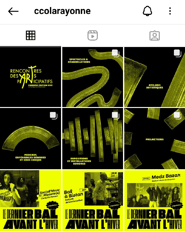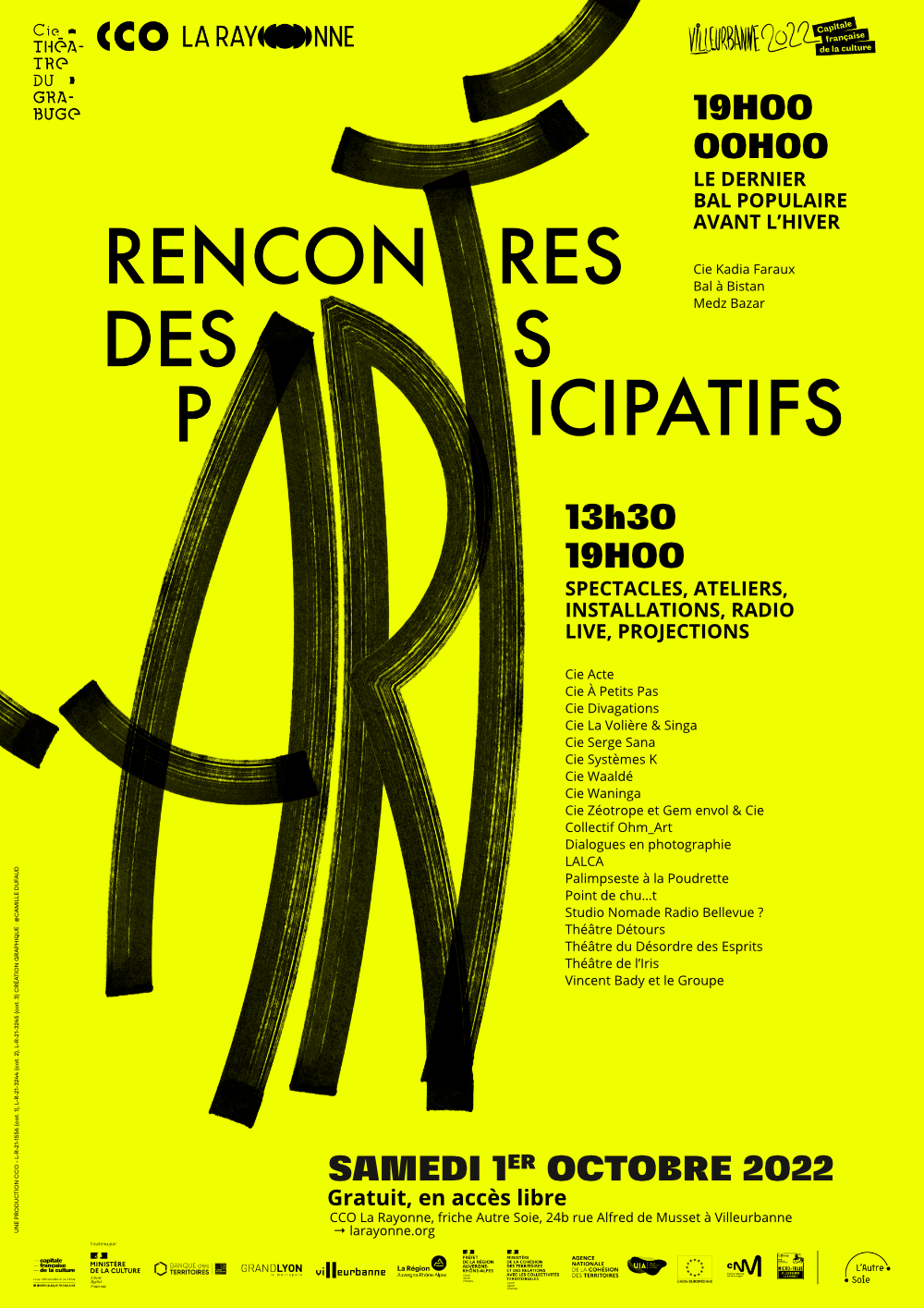 En 2022, le CCO (Centre culturel à Villeurbanne) et le théâtre du Grabuge proposent un nouvel évènement accessible à tous : Les Rencontres des Arts Participatifs. Sur plusieurs jours et plusieurs lieux, des dizaines de spectacles et d’ateliers sont proposés gratuitement. Les deux commanditaires ont besoin d’une charte graphique de l’évènement, de plusieurs supports généraux pour l’annoncer (affiches, tracts, web…) et de déclinaisons pour détailler l’heure et le contenu des différents spectacles. La journée est clôturée par des concerts, pour lesquels on s’inspire de la communication réalisée pour la fête internationale du 14 Juillet.